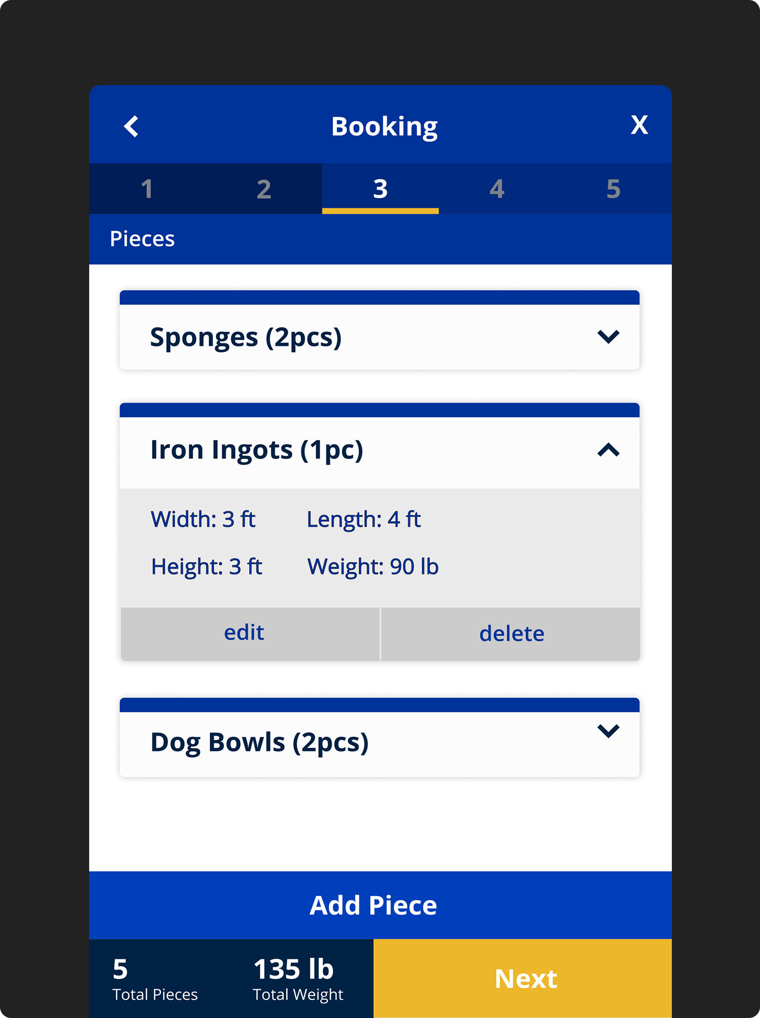 Forms allows users to punch in key details around the items within their cargo shipment. A series of smaller, chunked steps help to lighten up the cognitive load in making decisions.