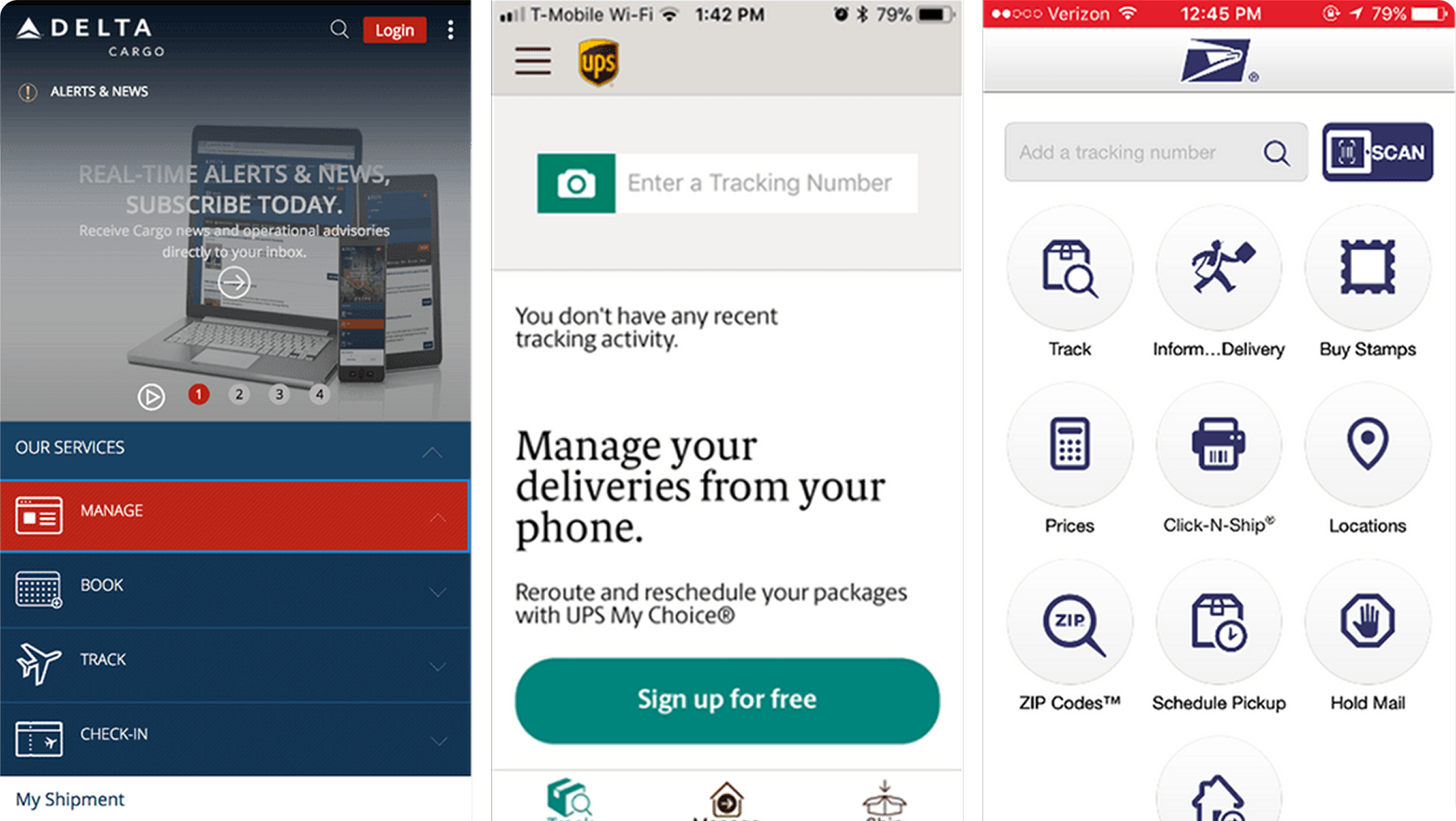 A competitive analysis of leading industry analogues for shipment processing and tracking led the team to a few key insights. Large, obvious UIs exist with clear, easily pressable buttons and smooth flows.