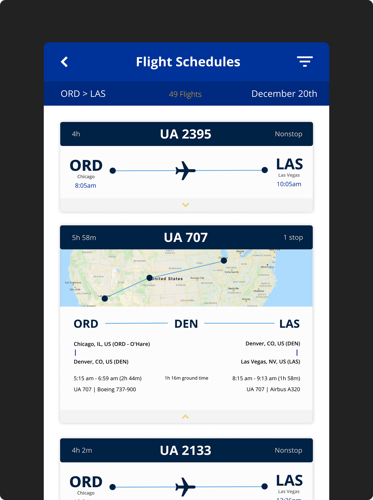 Users can view a feed of availabe flights on which their shipments can be packed and transported. Clear headers and comfortable card style help to create an intuitive mobile selection process.