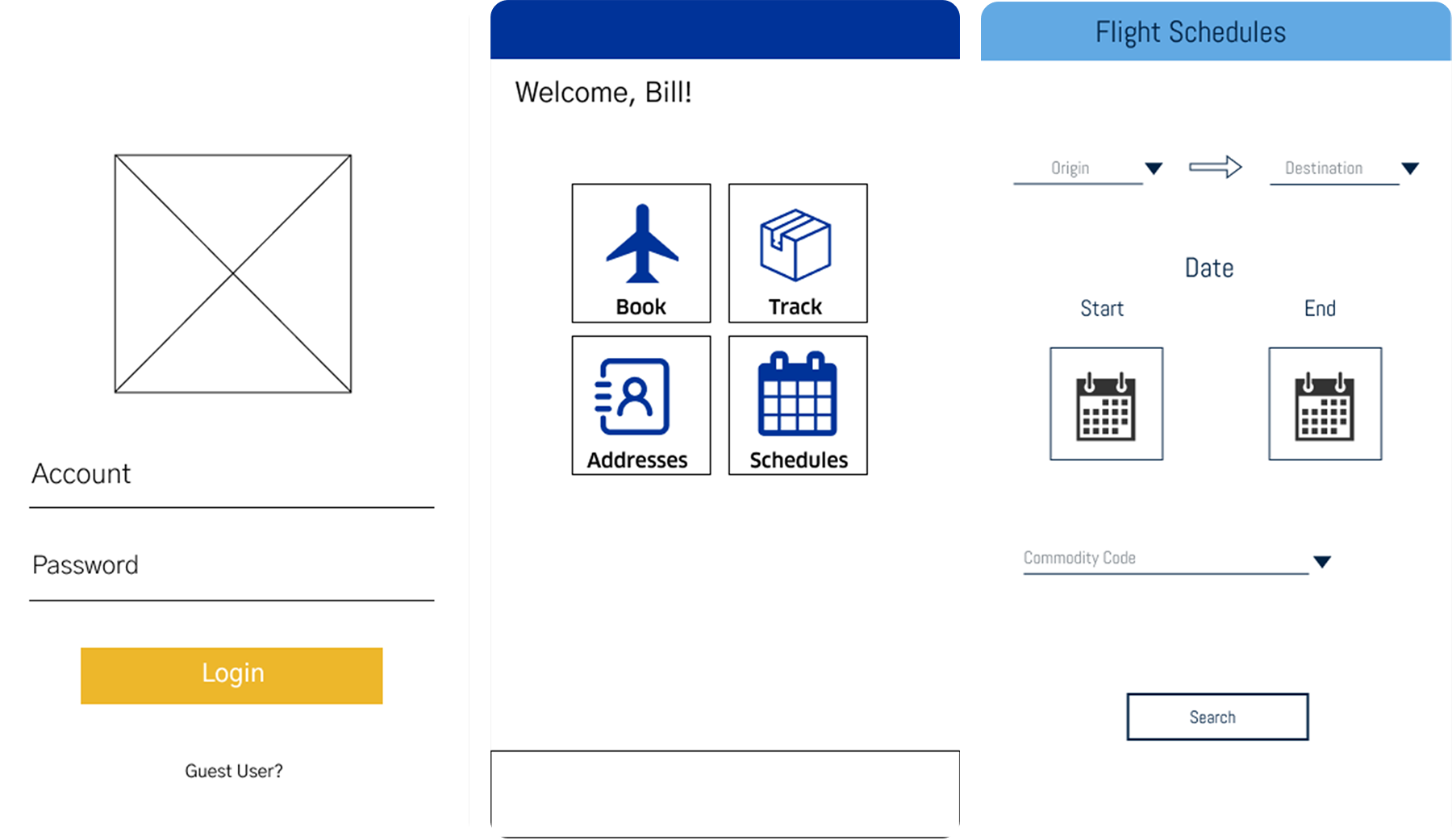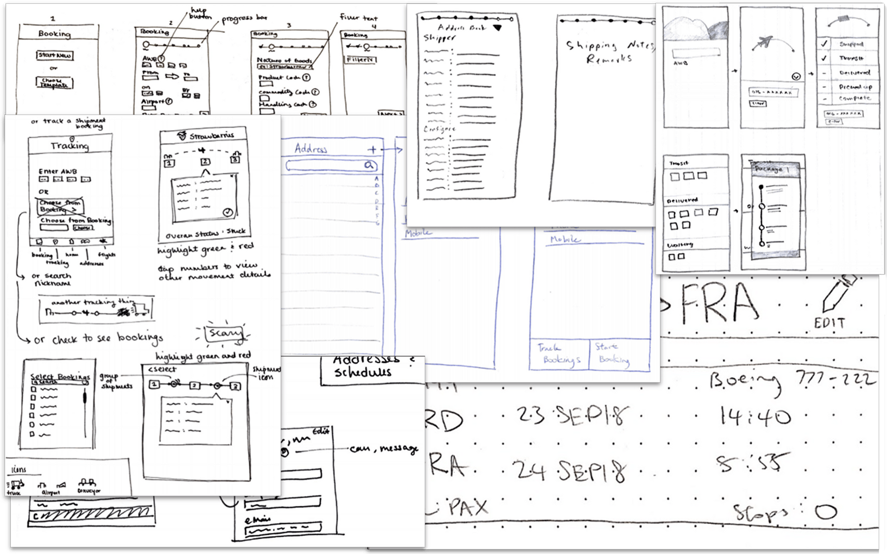 Our team took the core functionalities of cargo booking, shipping and tracking, as well as viewing flight schedules and began to sketch out striaghtforward user flows around these.