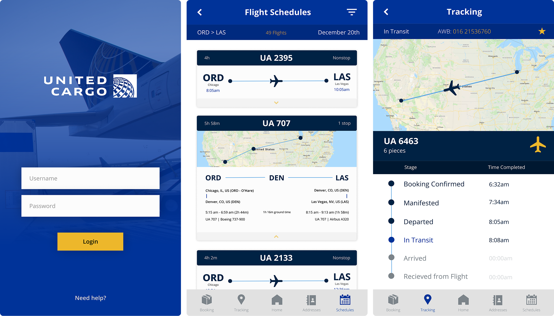 After booking a cargo shipment, users can track and analyze key details of the process. A streamlined UI shows only the most pertinent details of the flight tracking journey.